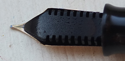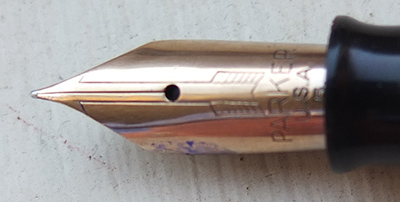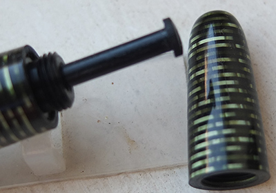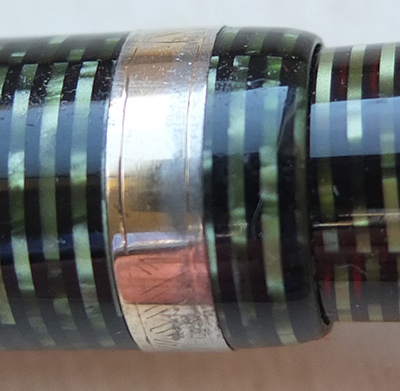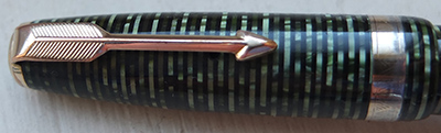 A very nice condition Major-size Vacumatic fountain pen in emerald pearl that has a plastic pump; there is a little plating wear on the band and on the high point6s of the clip. There are no cracks, splits, or engraved names and the tassie on the cap is black; there are one or two small marks consistent with use. The pen has been stripped, cleaned, had a new diaphragm fitted, reassembled, adjusted, and write tested. The nib is a fine grade single-colour 14ct gold, and I would think, original to the pen; it writes nicely. The imprint is not readable.