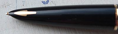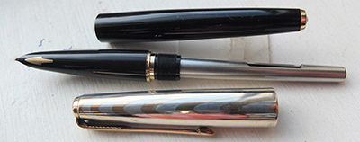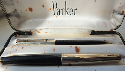 This is a very nice 61 Heirloom fountain pen and pencil set with gold-filled trim; it is in lovely condition and boxed too; the nib is a medium grade 14ct gold and writes nicely. The pencil has spare leads and an unused new eraser; the set is boxed and probably the original.