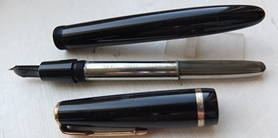 Here is a very nice almost mint condition Senior Duofold fountain pen in black from the 1960s with a crisp readable imprint; this pen has not been used much so is beautiful and any new owner, wanting to use it or add it to their collection, will be thrilled with it; it has a lovely fine grade 14ct gold No.35 nib and will write nicely.