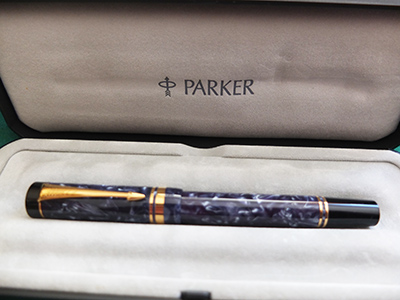 Here we have a very nice condition, almost mint, Parker International fountain pen in blue and black marbled finish and boxed too; the fountain pen is a cartridge or converter-fill, with a converter fitted, and an extra fine grade 18ct gold nib; this pen has not been used much so is in such super condition; there are no cracks, splits or scratches and the clip is firm; the pen is boxed and I would think it was the original.