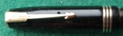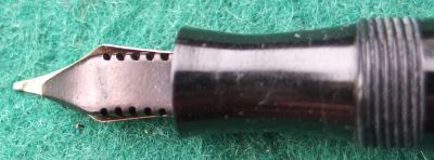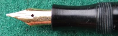 A nice condition extra-long Debutante-size Vacumatic fountain pen in black that has a plastic filler; there is no plating wear on the bands and just a little on the high points of the clip. There are no cracks or splits and virtually no scratches either; the clip tassie is black. The pen has been stripped, cleaned, had a new diaphragm fitted, reassembled, adjusted, and write tested. The nib is a fine grade single-colour 14ct gold, and I would think, original to the pen; it writes nicely with some flexibility. The imprint is very readable.