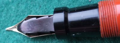 Here is a very nice Duofold Senior Lucky Curve fountain pen in red permanite from 1926 ish with a crisp imprint; this pen has been used so has a few small marks consistent with that use but it is not damaged and any new owner, wanting it to use, will be thrilled with it; it has a lovely extra-fine grade 14ct gold nib and writes nicely; the pen has obviously been well looked after, albeit used, but there are slight signs of plating wear on the band; there are slight signs of wear where the cap fits but not where it is posted. Please note the pen is boxed but its not the original.