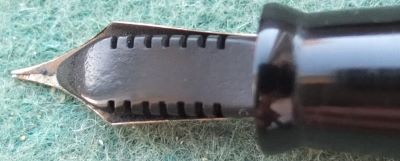 A very nice condition Junior Duovac fountain pen and pencil set in blue, silver and black with gold-plated trim; the pen has a vacumatic style plastic pump; there is virtually no plating wear on the bands, the nozzle, or the clips. There are no cracks or splits and virtually no scratches either. The pen has been stripped, cleaned, had a new diaphragm fitted, reassembled, adjusted, and write tested. The nib is a fine grade 14ct gold, and I would think, original to the pen; it writes nicely. The imprint is very readable and the set is boxed but I not sure its the original.