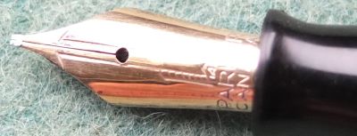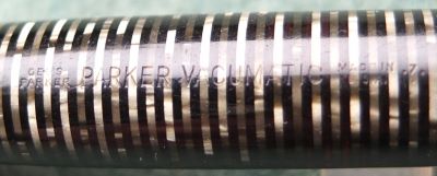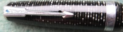A very nice condition blue diamond Major-size Vacumatic fountain pen in silver pearl that has a plastic filler and nickel-plated trim; there is no plating wear on the band, or the clip. There are no cracks or splits and virtually no scratches either; the clip tassie is black. The pen has been stripped, cleaned, had a new diaphragm fitted, reassembled, adjusted, and write tested. The nib is a broad grade single-colour 14ct gold, and I would think, original to the pen; it writes nicely. The imprint is very readable and better than it looks in the picture.