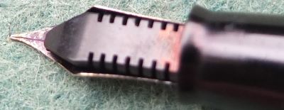 A very nice condition Major-size Vacumatic fountain pen in azure blue pearl that has a plastic filler and gold-plated trim; there is no plating wear on the band, or the clip. There are no cracks or splits and virtually no scratches either; the clip tassie is black. The pen has been stripped, cleaned, had a new diaphragm fitted, reassembled, adjusted, and write tested. The nib is a fine grade single-colour 14ct gold, and I would think, original to the pen; it writes nicely. The imprint is very readable and better than it looks in the picture.