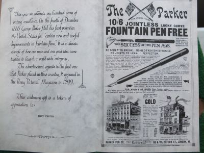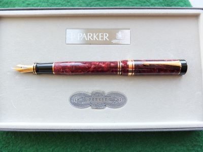 Here we have a mint condition Parker Centennial fountain pen in red and black marbled finish; the fountain pen is a cartridge or converter-fill, with a converter fitted, and a fine grade 18ct gold nib; this pen has not been used so is in such super condition however, it has been inked; there are no cracks, splits or scratches and the clip is firm; the pen is boxed and I'm assured it is the original. This pen was given as a Centennary Gift to a retiring employee after 25 years service and comes with the related leaflet. Please note the box is good but the outer card box is torn in a couple of places.