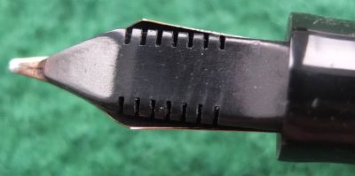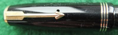 A superb condition oversize Vacumatic fountain pen in black that has an aluminium lock-away filler; there is no plating wear on the bands and just a little on the high points of the tassie ring and the clip. There are no cracks or splits and virtually no scratches either; the blind cap tassie and the clip tassie is black. The pen has been stripped, cleaned, had a new diaphragm fitted, reassembled, adjusted, and write tested. The nib is a broad grade single-colour 14ct gold, and I would think, original to the pen; it writes beautifully. The imprint is very readable.