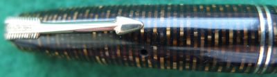 A very nice condition standard-size Vacumatic fountain pen in golden pearl that has a plastic filler and gold-plated trim; there is a little plating wear on the bands and on the clip. There are no cracks or splits but just a few fine scratches; the clip tassie is black. The pen has been stripped, cleaned, had a new diaphragm fitted, reassembled, adjusted, and write tested. The nib is a fine grade single-colour 14ct gold, and I would think, original to the pen; it writes nicely. The imprint is very readable.