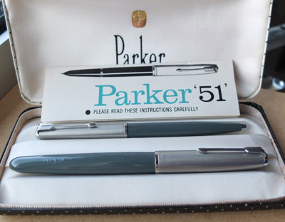 Here we have a lightly used Parker 51 fountain pen and ballpen set in grey with lustaloy caps; the pen has a medium grade 14ct gold nib and is an aerometric filler; neither the pen nor the ballpen have been used very much as the condition is so good; the fountain pen still has chalk marks on the barrel and the ink sac is see-through; there are no cracks, splits or serious scratches and the clips are firm; there is no name or initials on the pens.