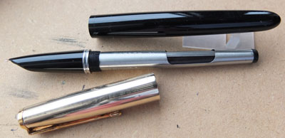 Here we have a nice condition Parker 51 fountain pen in black with a gold-filled cap; the pen is from the early 1960s and one can see that it has been used from its condition however, the pen has a lovely big broad grade nib and is a squeezy-filler; the pen cap does have a small bruise or two which are not easily seen.