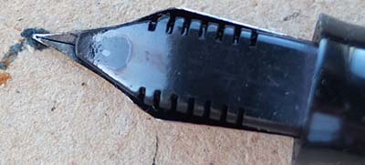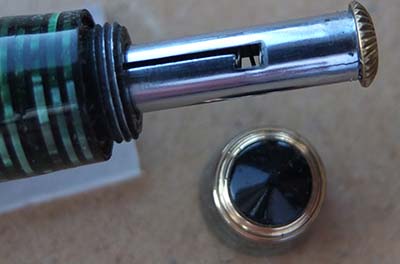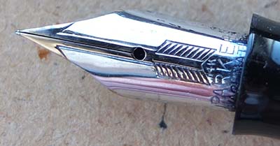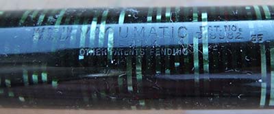 A nice condition Canada-made Oversize Vacumatic fountain pen in emerald pearl; the pen has a steel lock-away pump; there is little or no plating wear on the bands but the tassie ring and the clip have a few spots of wear. There are no cracks, splits, or engraved names and the tassie on the clip is emerald pearl but the one on the blind cap is black; there are one or two small marks consistent with use. The pen has been stripped, cleaned, had a new diaphragm fitted, reassembled, adjusted, and write tested. The nib is a fine grade two-colour 14ct gold, and I would think, original to the pen; it writes nicely. The imprint on the barrel is readable but not crsp.