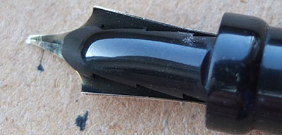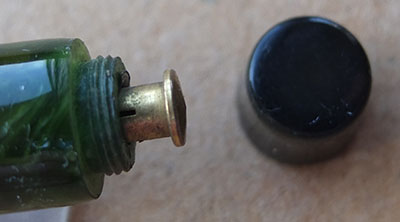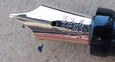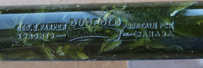 Here is a very nice Duofold Senior Lucky Curve in jade green permanite from 1926 ish with a very readable imprint; this pen has been used so has a few small marks consistent with that use but it is not damaged and any new owner, wanting it to use or add it to his/her collection, will be thrilled with it; it has a lovely medium oblique grade grade 14ct gold nib and writes nicely; the pen has obviously been well looked after, albeit used, as there are only slight signs of plating wear on the clip but none on the band; there are slight signs of wear where the cap fits but none where it is posted. This is an everyday pen or could be added to a treasured collection and not look out of place. Please be aware thast the barrel has darkened a little, as is quite usual for this material.