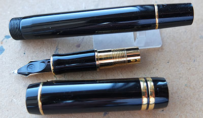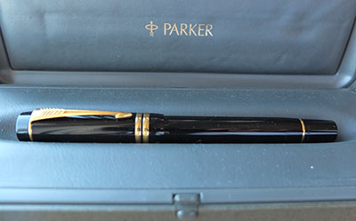 Here we have a very nice condition, almost mint, Parker International cartridge or converter-fill fountain pen in black with gold-filled trim; the pen has a medium grade 18ct gold nib; this pen has not been used much so is in such super condition; there are no cracks, splits or scratches and the clip is firm; the pen uses cartridges or a converter and there is a converter fitted. The pen is boxed and I would think it was the original.