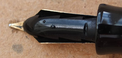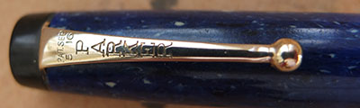 Here is a very nice Duofold Junior Streamline fountain pen in lapis permanite from 1926 ish with a thin but readable imprint; this pen has been used so has a few small marks consistent with that use but it is not damaged and any new owner, wanting it to use, will be thrilled with it; it has a lovely fine grade 14ct gold nib and writes nicely; the pen has obviously been well looked after, albeit used, as there are only slight signs of plating wear on the clip and the bands; there are slight signs of wear where the cap fits and where it is posted.