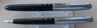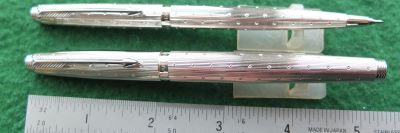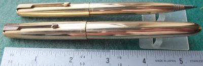 par349: A lightly-used 51 fountain pen and ballpen set in grey with lustaloy caps and in their original box; the pen is an aerometric(squeezy)-filler and has not had a lot of use looking at the condition of it as the sac is see-through and there are still chalk marks on the pen barrel; the ballpen is equally good but no chalk marks; the pen has a medium grade 14ct gold nib and writes nicely £175.00 SOLD |