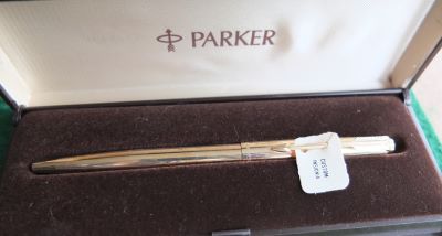 par1185: An almost mint Parker Sonnet fountain pen with a medium grade 18ct gold nib; the pen has not been used and is a cartridge or converter-fill with a converter fitted; the pen has chrome-plated trim and is in its original box; this is a very nice pen £75.00 SOLD |
