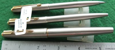 par1121: A very nice 51 aerometric fountain pen, ballpen, and pencil set in black with gold-filled caps; the fountain pen has a medium grade 14ct gold nib; this is a lovely example of a desireable pen set. £195.00 |