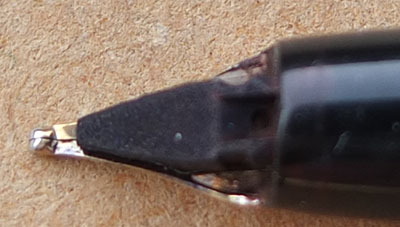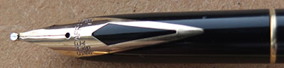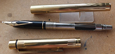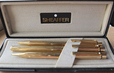 This is a very nice set where the fountain pen has been used but the ballpen and the pencil have not been used much, if at all; the surfaces are very good and there are no cracks, splits or dings; the clips are secure. The nib is a broad grade 14ct gold and marked USA; the pen will take cartridges or a converter which is in fact fitted. The cartouches are blank. The ballpen uses the new Sheaffer refills which are readily available and the pencil has spare leads and a new eraser.