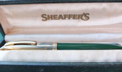 A Sheaffer PFM (PFM meaning Pen for Men) is a little larger than the average pen but still not too large for a ladies hand and I know a few ladies that use one as an everyday pen; it uses the unusual snorkel filling system which is generally found to be quite a talking point; these pens were made in 1959 in five colours viz. black, burgundy, blue, green, and grey and in five models viz. PFM I, PFM II, PFM III, PFM IV, and PFM V; this pen is the green one with the gold electroplated cap and trim.