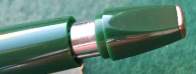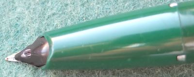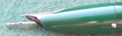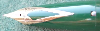 This is another green PFM V pen in perfect mechanical condition but has been used so there are fine surface scratches visible under a glass however, it is in beautiful condition; this cap and barrel are both good with no plating wear to the cap and trim; the clip is secure. The nib is a lovely fine grade 14k gold and writes nicely.