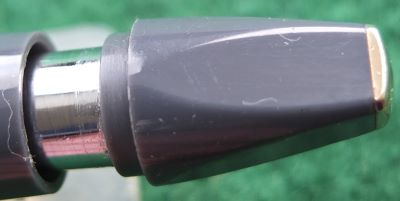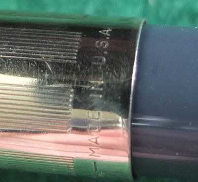 This is another green PFM V pen in perfect mechanical condition but has been used so there are fine surface scratches visible under a glass however, it is in beautiful condition; this cap and barrel are both good with no plating wear to the cap and trim, one small mark on the cap as shown in the last picture, and only small dents to the cap top; the clip is secure but the head of the white button is missing. The nib is a lovely broad grade 14k gold and writes nicely.