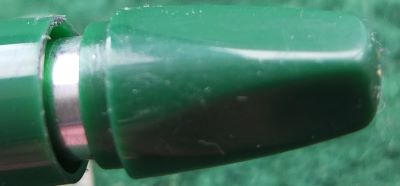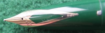 This is another green PFM III pen in perfect mechanical condition but has been used so there are fine surface scratches visible under a glass however, it is in beautiful condition; this cap and barrel are both good with no plating wear to the trim; the clip is secure. The nib is a lovely broad grade 14k gold and writes nicely.