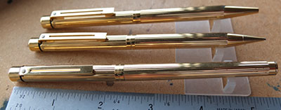 shea190: A nice undamaged Slim Targa fountain pen, pencil, and ballpen set in gold electroplated finish with gold-plated trim and boxed; the pen has a broad grade 14ct gold inlet nib and writes delightfully; the pen uses cartridges or a converter and there is a converter fitted; beautiful ! The pen has been used but the ballpen and the pencil look like they have never been used. £155.00 |