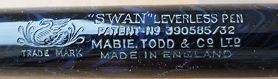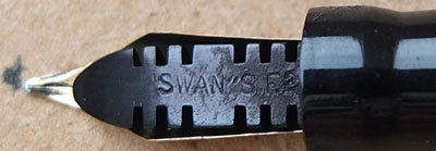 Here is a classy-looking Swan L205/52 leverless in very nice condition, albeit a little worn through use, with a 14ct gold medium grade No.2 nib; the pen is in very good condition but there are signs of use in the form of a little wear where the cap fits and where it has been posted; there are no cracks, splits or serious scratches and no signs of plating wear on the clip or the band; the nib, by my classification, is a nice writer but not very flexible; this pen would make a good daily-use pen or could be added to a collection and not look out of place.