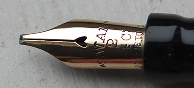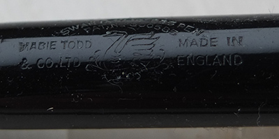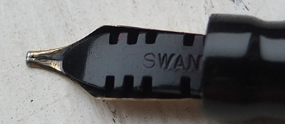 Here is a classy-looking Swan 0160 leverless in very nice condition, albeit a little worn through use, with a 14ct gold broad grade No.2 slightly flexible nib; the pen is in very good condition but there are signs of use in the form of a little wear where the cap fits and where it has been posted; there are no cracks, splits or serious scratches and only slight signs of plating wear on the clip and the band; the nib, by my classification, is a nice writer and a little flexible; this pen would make a good daily-use pen or could be added to a collection and not look out of place.