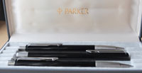 bel104: A very nice hardly-used Parker Vector fountain pen, ballpen, and pencil set in black and brushed steel from the 1990s; the pen is a cartridge or converter-filler and has a converter fitted; it has a medium grade nib and writes nicely; boxed too. £20.00 SOLD