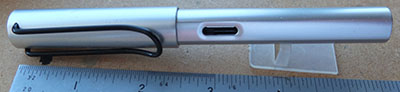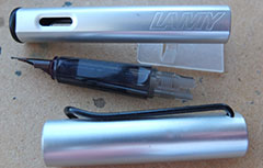 bel263: A used Lamy fountain pen in brushed plastic with a medium grade nib; it uses cartridges or a converter and both are readily available on the High Street. £15.00