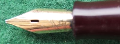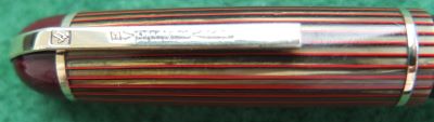 A very nice Wahl Eversharp Skyline in brown with a brown and black striped cap; the pen is a lever-filler and has a broad 14ct gold quite flexible nib