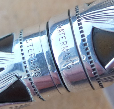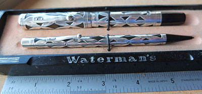 Here is a very nice 452 fountain pen and pencil set in black with a Sterling Silver filigree overlay; it was made in the mid to late 1920s and has been used quite carefully; it looks lovely and will perform really well; the pen has a medium grade 14ct gold semi-flexible No.2 nib and is a lever-filler which needs to be filled from a bottle. Everything about these items is good and crisp; the clips are secure. The set is boxed and I think it is original but it has sustained some damage to the end. These Watermans are difficult to find, especially ones as good as this. Please note the 6th picture makes it look like the top of the pen is dented but it is not.