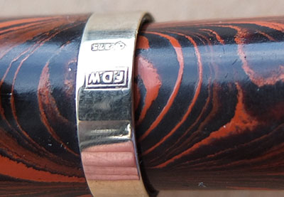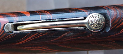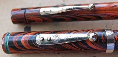 Here we have a very nice No.7 fountain pen and pencil set in red ripple with gold plated trim; the pen has a green coloured nib and cap band; the imprint on the barrel has allbut disappeared and there is just a little sign of marking where the cap fits but not where it is posted; the plating on the lever is good as it is on the clip and the cap band is 9ct gold; there are no cracks, splits or noticeable scratches; the clip is secure and the number 7 on the end of the barrel is clearly readable.