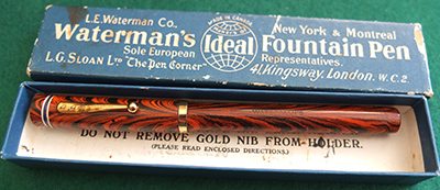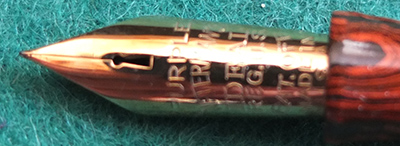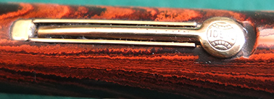 Here we have a very nice No.5 fountain pen in red ripple with gold plated trim; the pen has a purple coloured nib and cap band; the imprint on the barrel is very readable and there is just a little sign of marking where the cap fits and where it is posted; the plating on the lever is good as it is on the clip and the cap band; there are no cracks, splits or noticeable scratches; the clip is secure and the number 5 on the end of the barrel is clearly readable.