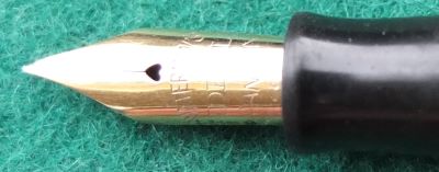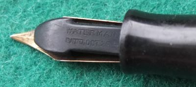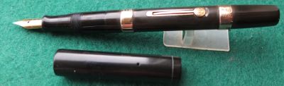 Here we have a very nice No.54 fountain pen in black with a gold plated lever and two 9ct gold barrel bands; the pen has a medium grade 14ct gold No.2 nib and writes nicely with quite some flex; the imprint on the barrel is unreadable but the 54 on the barrel end is readable; the plating on the lever is good and there are no cracks, splits or noticeable scratches.