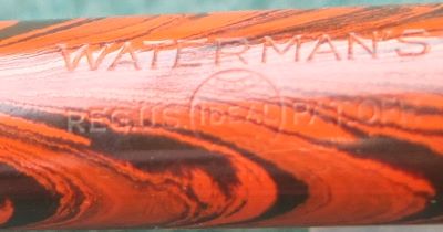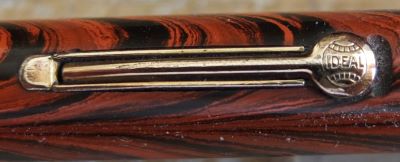 Here we have a very nice No.5 fountain pen in red ripple with gold plated trim; the pen has a pink coloured nib and cap band; the imprint on the barrel is very readable and there is just a little sign of marking where the cap fits but not where it is posted; the plating on the lever is good as it is on the clip and the cap band; there are no cracks, splits or noticeable scratches; the clip is secure and the number 5 on the end of the barrel is clearly readable.
