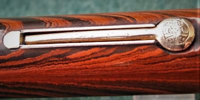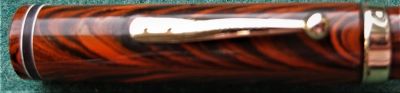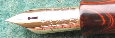 Here we have a very nice No.7 fountain pen in red ripple with gold plated trim; the pen has a purple coloured nib and cap band although the band is faded; the imprint on the barrel is very thin and there is just a little sign of marking where the cap fits but not where it is posted; the plating on the lever is a little worn as it is on the cap band but the clip is good; there are no cracks, splits or noticeable scratches; the clip is secure and the number 7 on the end of the barrel is clearly readable.