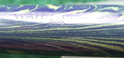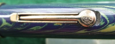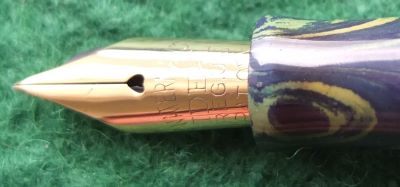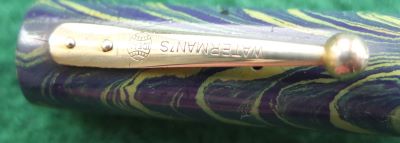 Here we have a very nice No.52V fountain pen in blue and yellow ripple with gold plated trim; the pen has a 14ct gold fine grade nib and writes nicely; the imprint on the barrel is readable and there is just a little sign of marking where the cap fits but not where it is posted; the plating on the clip and the lever is good; there are no cracks, splits or noticeable scratches; the clip is secure and the number 52V on the end of the barrel is clearly readable; the cap band is 9ct gold.