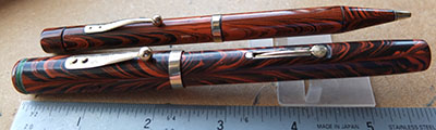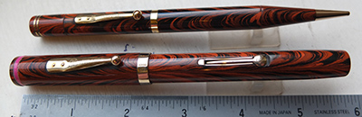 wart209: A very nice No.7 red ripple fountain pen and pencil set with gold plated trim; the pen has a green nib and a green cap band; the nib is a 'rigid' point 14ct gold and is 'tempered-to-armour-plated-hardness' suiting 'the salesman' to quote Waterman; it does write nicely but with no flexibility. The pencil is good with spare leads. £525.00 |